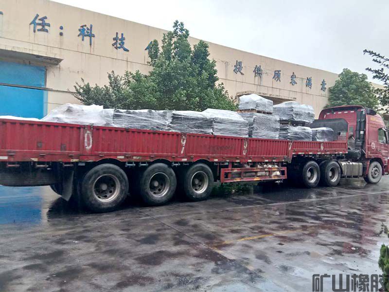 傍晚,貨車如期而至,老天似乎也賞臉,雨小了很多。細雨中,工人師傅開著叉車,將一托托包裝好的橡膠襯板有序的裝上貨車。